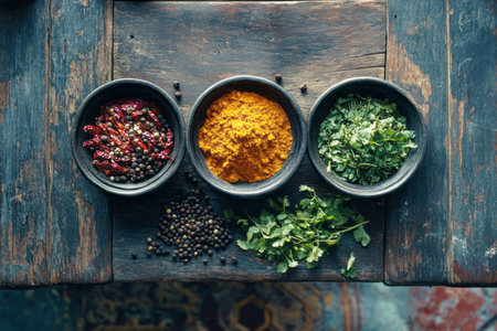 A collection of bowls filled with various Indian spices and herbs like turmeric, cumin, and coriander, arranged on a rustic wooden background, offering a rich, aromatic, traditional vibe