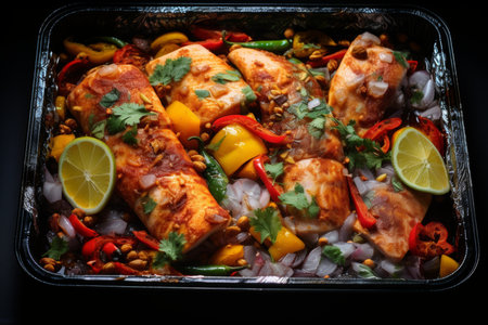 Grilled chicken breasts with bell peppers, lime, and cilantro in a foil container.