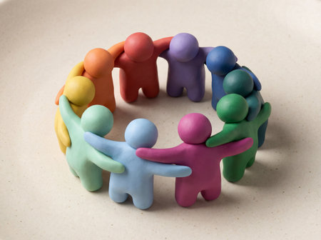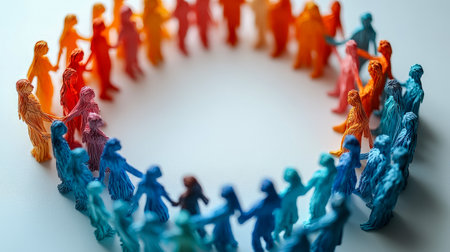 A circle of multicolored clay figures holding hands stands on a textured beige surface, representing concepts of diversity, teamwork, inclusion, global community, and friendship and solidarity.