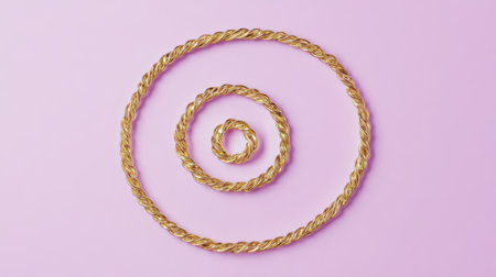 This image showcases an elegant arrangement of twisted gold jewelry pieces in perfect circles against a soft pastel pink backdrop, highlighting elegance and style.