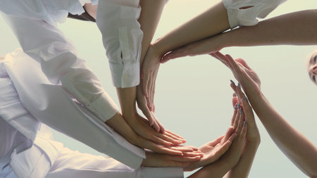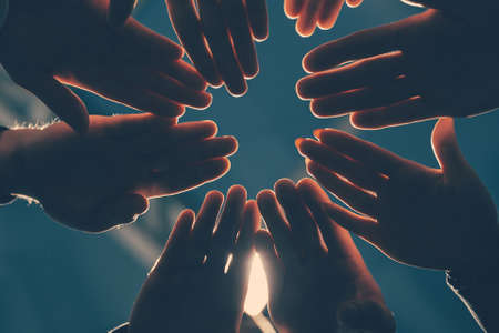 Group of happy multiracial business people joining hands to demonstrate unity and solidarity. View from below connected hands of people standing in circle. Mutual assistance, teamwork and team spirit.