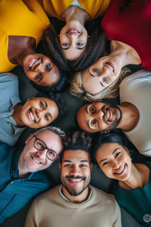 Creative shot from a high perspective of young people forming a circle, celebrating unity and diversity.