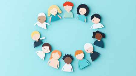 A group of multicolored paper cut figures hold hands in a circle against a blue background, diversity, teamwork, and collaboration. The minimalistic style emphasizes inclusivity and connection.