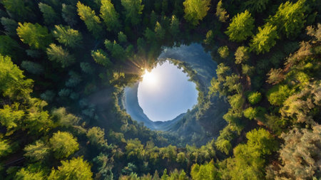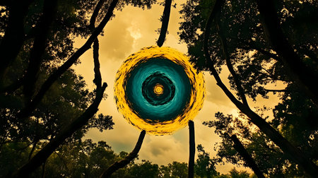 Abstract nature image featuring a vibrant circular pattern surrounded by dark trees, creating a surreal and mysterious atmosphere. Ideal for various design projects.