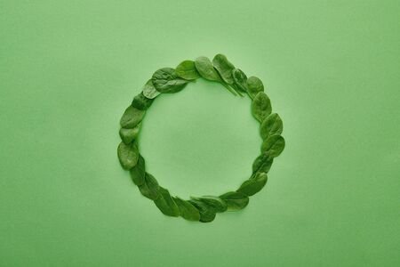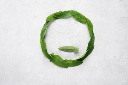 Fresh organic sage leaves lay in circle on light background. top view, copy space