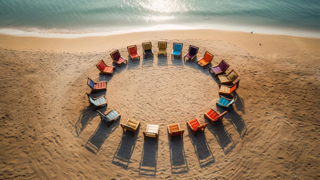 Generative AI : Aerial view of yoga group on sandy beach in summer with inflatable matresses