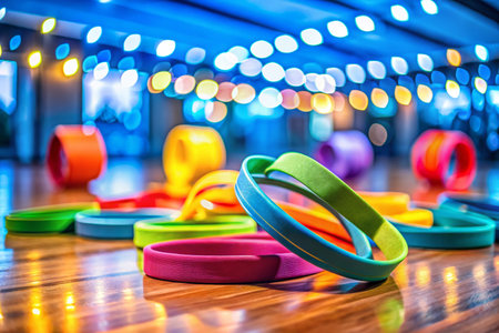 Colorful Fitness Tracker Bands on Gym Floor with Bokeh Background