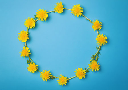Dandelions are skillfully arranged to create an empty circle on a bright blue backdrop. This playful composition highlights the contrast of colors and the beauty of nature.