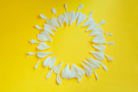 White flower petals on yellow background. Creative design for greeting card. Spring and sun concept. Copy space.