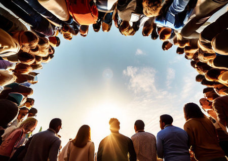 Group of people from various backgrounds standing in a circle on an expansive terrain, with shadows stretching towards the center, creating a sense of connection and community