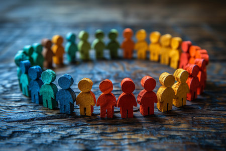 Artistic top-down macro shot of rainbow-colored pawns forming a circular connection. This image symbolizes unity and diversity, captured with bright, clean lighting.