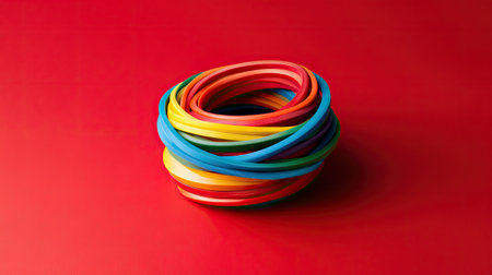 Stack of colorful rubber bands wrapped tightly into a ball, centered on a bold red background with dramatic lighting