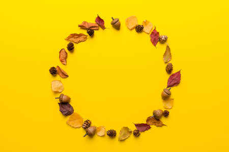 Autumn composition made of dried leaves, cones and acorns on table. Flat lay, top view.
