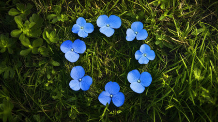 A mesmerizing display of blue flowers arranged in a circular pattern on vibrant green grass, capturing the essence of nature