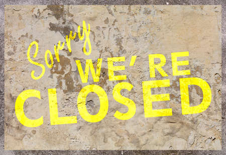 Closed sign. Yellow color text Sorry we re closed on beige marble stone background, Information about closed business or store concept.
