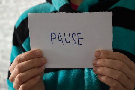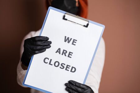 Woman holding blank with inscription we are closed calling for stop spreading covid-19.