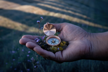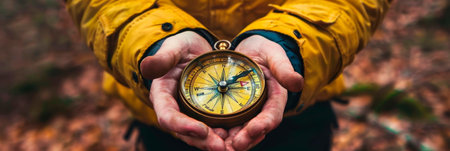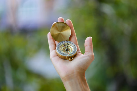 Close up of a campers hand gently holding a compass, providing a sense of direction and adventure during a summer camping trip amidst nature