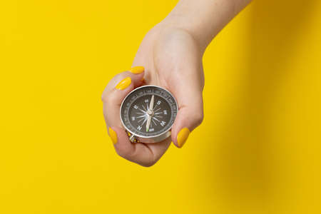Tourists hand holding a compass on a yellow background, travel lifestyle, summer vacation concept