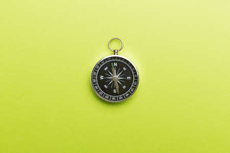 Silver compass on color background. Top view.