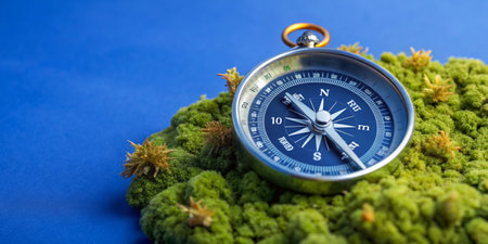A compass on soft moss with a beautiful blue background, perfect for nature adventures
