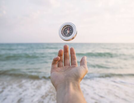 Compass in hand against the background of the sea and sunset.