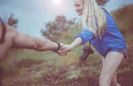Backpackers lover getting help to friends climb a rock,Helping hand,Overcoming obstacle concept