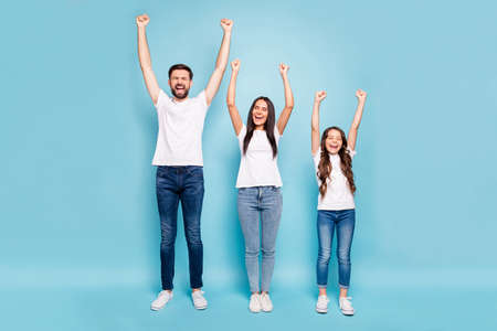 Full size photo of delighted three mom mommy dad daddy offspring with brown hair celebrate triumph raise fists scream yeah wear white t-shirt denim jeans sneakers isolated over blue color background