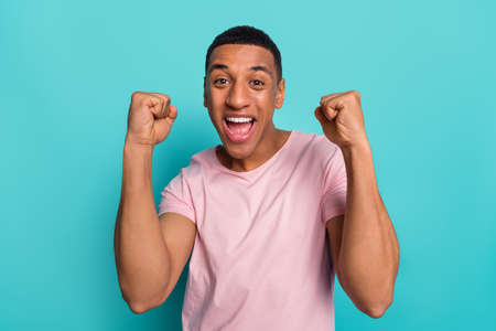 Photo of lucky impressed young man dressed pink t-shirt rising fists yelling isolated turquoise color background