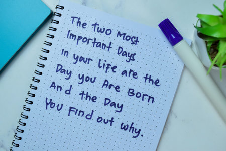 Concept of The Two Most Important Days In Your Life Are The Day You Are Born And The Day You Find Out Why write on book isolated on Wooden Table.