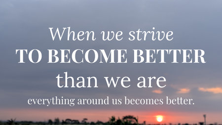 A motivating quote on personal improvement is displayed over a soft, cloudy sky at sunrise. The text states "When we strive to BECOME BETTER than we are everything around us becomes better".