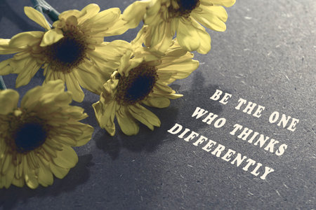 Motivational quote with sunflowers on wooden desk - Be the one who thinks differently.