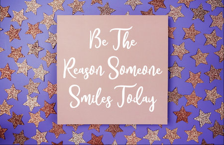 Be The Reason Someone Smiles Today text motivational and inspiration quote on paper card with star glitter decoration flat lay on purple background