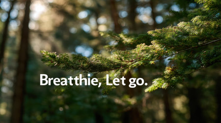 A tree branch with the words breathe, let go written below it. Concept of calm and relaxation, encouraging the viewer to take a moment to pause and breathe deeply