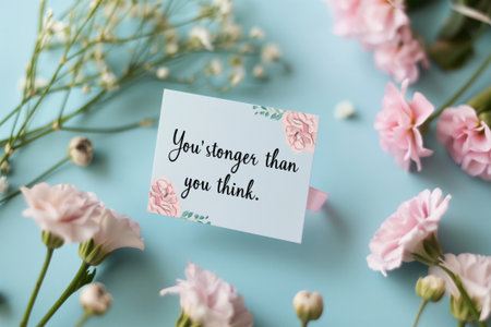 Greeting card with the empowering message you're stronger than you think. Surrounded by delicate pink flowers on a soft blue background