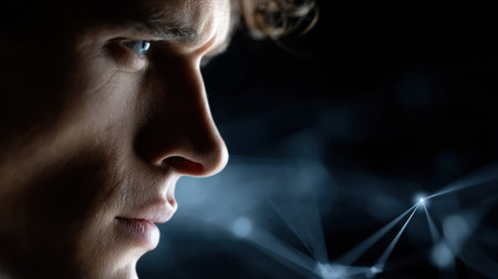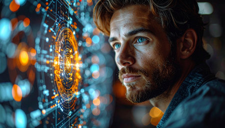 Confident young adult portrait with digital circuitry overlay blending human and technology