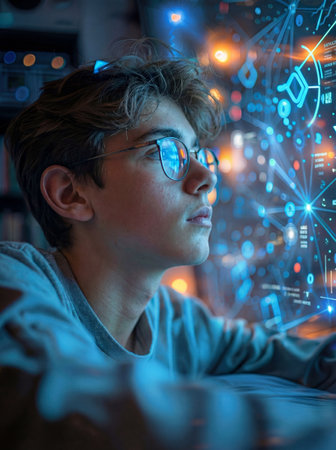 Young man with glasses watching futuristic digital hologram.