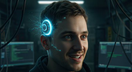 A young adult with a joyful expression is situated in a high-tech laboratory filled with computer screens displaying complex data. Electronic wires surround him, and a glowing cybernetic implant hovers beside his head, suggesting a fusion of human and machine capabilities. The dimly lit setting adds to the atmosphere of innovation and experimentation. The subject appears intrigued by the technology that enhances his mental faculties, showcasing a potential future of human evolution.