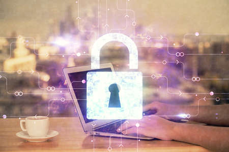 Double exposure of woman hands working on computer and lock hologram drawing. Security concept.