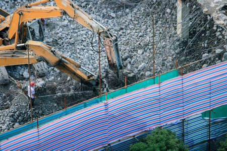 Aerial view of Building House Demolition and construction site Excavator with hydraulic crasher machine