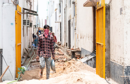 GHAZIABAD, UTTAR PRADESH / INDIA - JUNE 2020 : Young Indian male labor working at construction site with having Medical Mask on his face to prevent from Virus and Dust