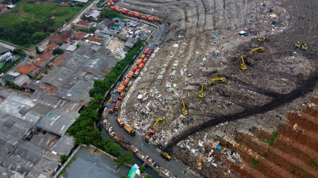 Aerial View. Large landfills like mountains. the tractor take garbage on landfills at Bekasi - Indonesia