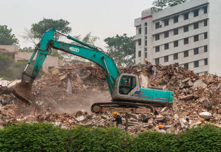 Chongqing, China - May 9, 2010: Downtown, off Peoples Square. Green Kobelco demolition crane on top of pile of stone rubble. Green foliage and white building in back. Workers present.