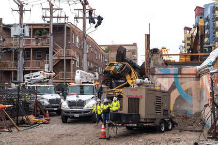 Chicago, IL - October 7th, 2021: Comed electricians work on restoring power where a construction pile driving drill rig tipped over the day prior while doing work near the Bryn Mawr CTA train station.