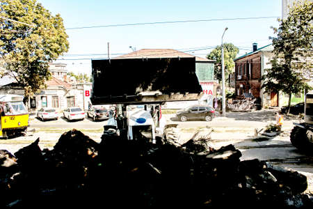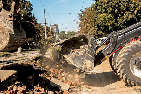 Dnepropetrovsk, Ukraine - 09.15.2021: Excavator, grader and workers remove debris after dismantling a tram stop. Works on tram tracks.