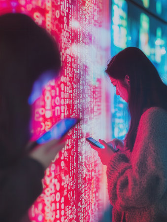 Individuals with bowed heads focus on their smartphones, surrounded by glowing digital numbers, highlighting modern isolation in a connected world.