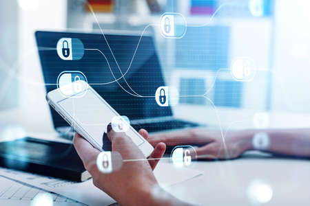 Businessman with a mobile phone is secure in his account. The concept is hacking a Phishing mobile phone with a password to access a smartphone, security threats online, and fraud.