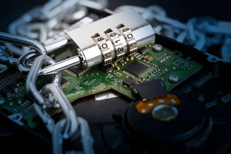 Encrypted hard disk. Padlock with cipher on an opened hard disk. Data loss. computer motherboard. the concept of data, hardware, information technology and cyber security.