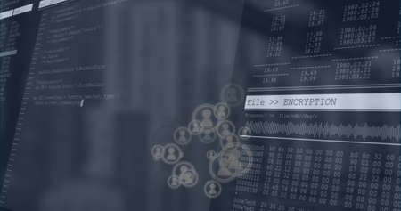 Image of profile icons over encryption text with glitch technique and circuit board pattern. Digitally generated, hologram, television, codes, security, protection, cryptography and technology.
