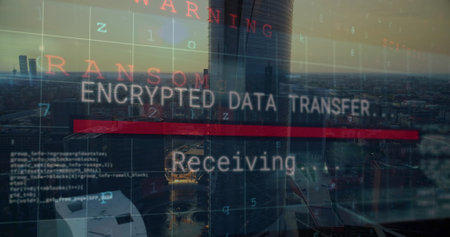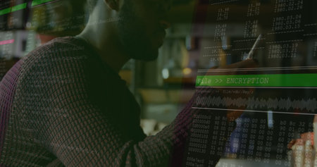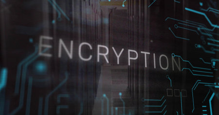 Image of encryption text banner over binary coding and microprocessor connections. Computer interface and cyber security technology concept