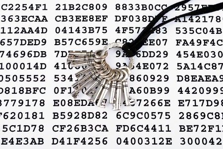 A big bunch of keys, laid out in a circle, from the different locks, lies on a plane white background, copy space.
